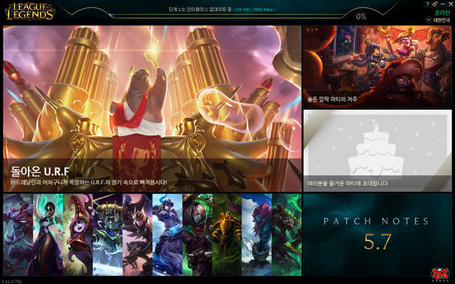 라이엇게임즈는 9일 오후 1시까지 예정됐던 서버 점검 및 업데이트를 5시간 29분 앞당긴 오전 7시 31분 완료했다. 이번 롤점검으로 적용된 업데이트는 5.7패치로 대규모 패치의 결과로 소외되었거나 지나치게 유리해진 챔피언들을 조금씩 구제해주는 사후지원 성격으로 생각해달라는 것이 라이엇게임즈의 설명.