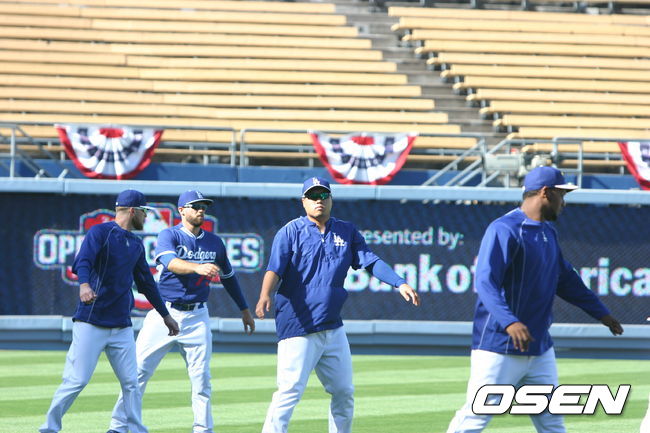 LA 다저스 류현진이 9일(이하 한국시간)다저스타디움에서 동료들과 함께 몸을 풀고 있다.