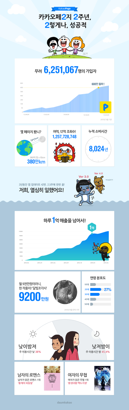 지난 2년 동안 카카오페이지는 이용자 의견을 반영해 42번의 업그레이드를 진행했다. 2.5주에 한번 꼴로 서비스 개선에 나선 셈이다. 이러한 노력의 결과 카카오페이지는 매 분기마다 평균 140%에 달하는 매출 성장의 결실을 맺었다. 2015년 1분기에는 전년동기 대비 4배의 매출 성장을 이뤘고, 올 초 일 매출 1억을 달성하는 등 콘텐츠 유료화 정착을 위한 광폭 행보를 이어나가고 있다. 이용자도 급증하며 지난 1분기 이용자 규모는 전년동기 대비 3.7배 증가해, 누적 가입자 수 약 630만명을 보유한 대표 모바일 콘텐츠 플랫폼으로 거듭났다.