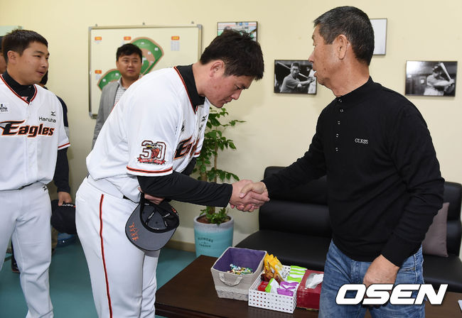 9일 오후 대전시 한화생명 이글스 파크에서 열리는 '2015 타이어뱅크 KBO 리그' 한화 이글스와 LG 트윈스의 경기 시작전 김성근 감독이 이성열, 허도환과 악수를 하고 있다.