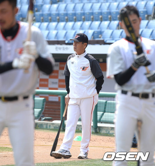 9일 오후 대전시 한화생명 이글스 파크에서 열리는 '2015 타이어뱅크 KBO 리그' 한화 이글스와 LG 트윈스의 경기 시작전 김성근 감독이 선수들의 훈련 모습을 지켜보고 있다.