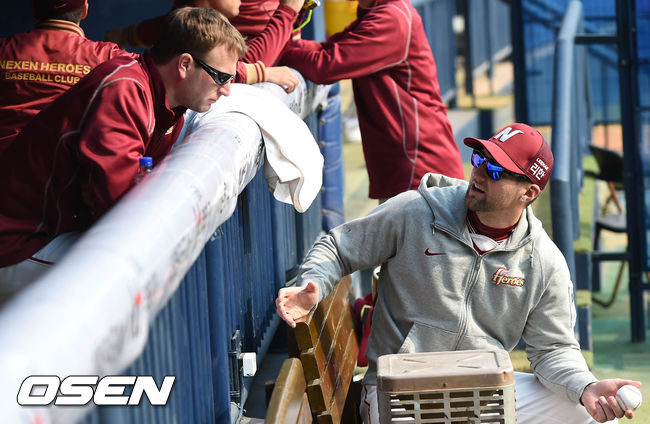 9일 오후 서울 잠실야구장에서 열린 '2015 타이어뱅크 KBO 리그' 두산 베어스와 넥센 히어로즈의 경기, 경기시작전 넥센 피어밴드와 밴헤켄이 이야기를 나누고 있다.
