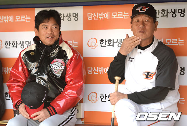 9일 오후 대전시 한화생명 이글스 파크에서 열리는 '2015 타이어뱅크 KBO 리그' 한화 이글스와 LG 트윈스의 경기 시작전 양상문 감독과 김성근 감독이 이야기를 나누고 있다.