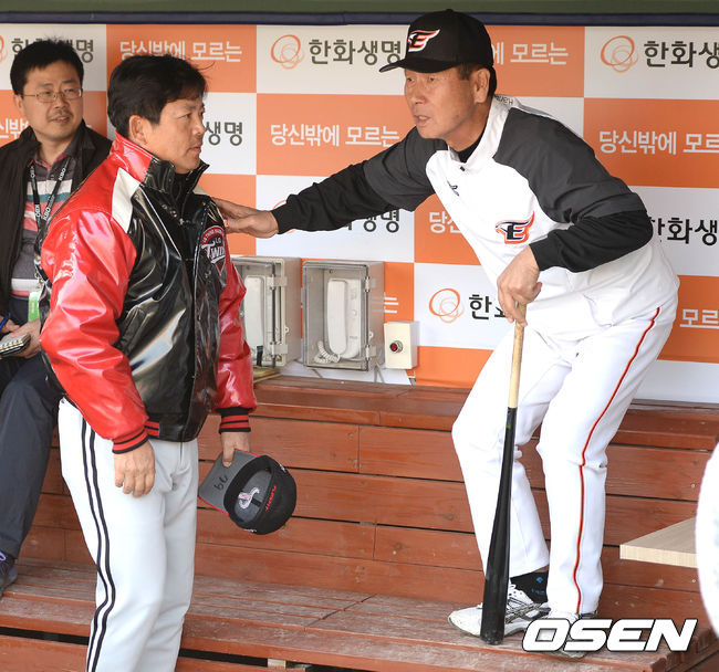 9일 오후 대전시 한화생명 이글스 파크에서 열리는 '2015 타이어뱅크 KBO 리그' 한화 이글스와 LG 트윈스의 경기 시작전 김성근 감독과 양상문 감독이 이야기를 나누고 있다.