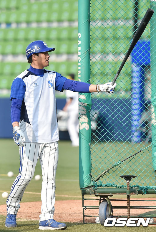 9일 오후 대구시민운동장 야구장에서 '2015 타이어뱅크 KBO 리그' 삼성 라이온즈와 롯데 자이언츠의 경기가 열릴 예정인 가운데, 양팀 훈련 시간에 타격연습을 마친 삼성 김상수가 배트를 들어올리며 감격하고 있다.