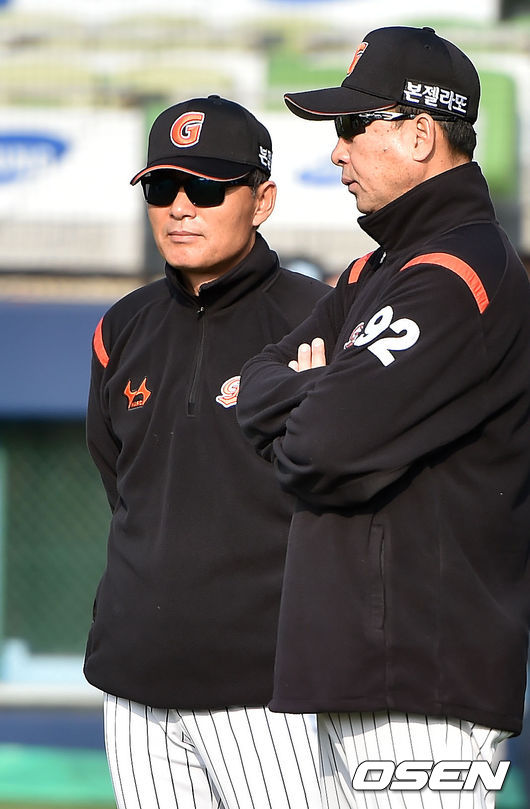 9일 오후 대구시민운동장 야구장에서 '2015 타이어뱅크 KBO 리그' 삼성 라이온즈와 롯데 자이언츠의 경기가 열릴 예정인 가운데, 양팀 훈련 시간에 롯데 이종운 감독과 김민호 수석코치가 선수들의 훈련을 지켜보며 얘기를 나누고 있다.
