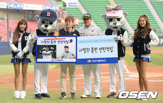 9일 오후 서울 잠실야구장에서 열린 '2015 타이어뱅크 KBO 리그' 두산 베어스와 넥센 히어로즈의 경기, 경기시작전 치뤄진 '사랑의 홈런' 협약식 행사에서 두산 홍성흔과 유리상자 이세준이 포토타임을 갖고 있다.