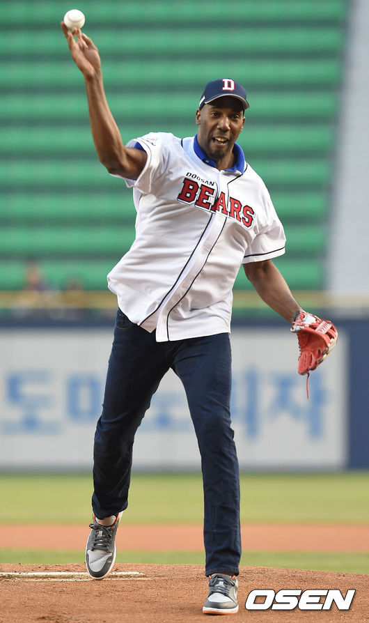 9일 오후 서울 잠실야구장에서 열린 '2015 타이어뱅크 KBO 리그' 두산 베어스와 넥센 히어로즈의 경기, 경기시작전 OK저축은행 배구선수 시몬이 시구하고 있다.