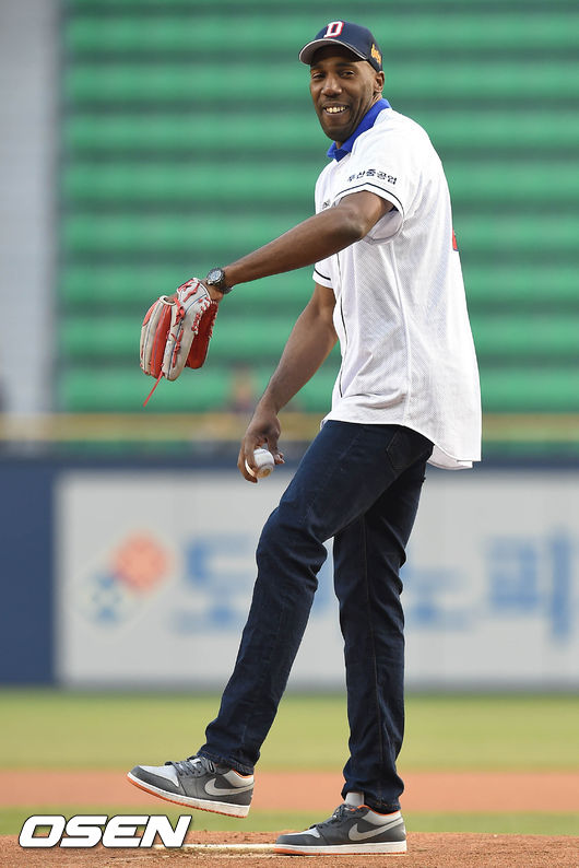 9일 오후 서울 잠실야구장에서 열린 '2015 타이어뱅크 KBO 리그' 두산 베어스와 넥센 히어로즈의 경기, 경기시작전 배구선수 시몬이 시구하고 있다.