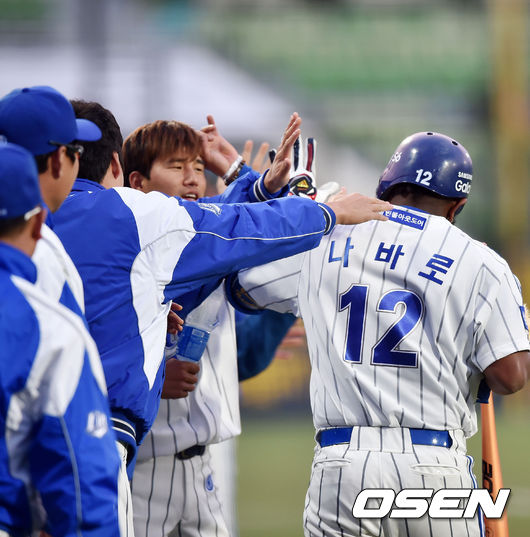 9일 오후 대구시민운동장 야구장에서 열린 '2015 타이어뱅크 KBO 리그' 삼성 라이온즈와 롯데 자이언츠의 경기, 1회말 삼성 선두타자 나바로가 좌월 선취 솔로홈런을 날린 후 덕아웃에서 동료들과 하이파이브를 하고 있다.