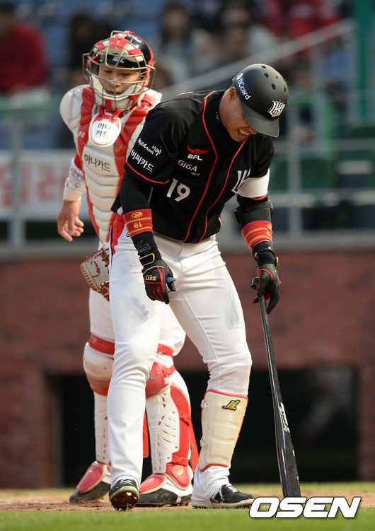 2회초 1사에서 SK 밴와트의 투구에 맞은 kt 김상현이 고통스러워하고 있다.