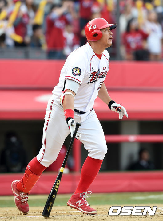 최희섭은 9일 광주-기아 챔피언스필드에서 열린 NC 다이노스와의 홈경기 첫 타석에서 오른쪽 담장을 넘기는 솔로홈런을 터트렸다.