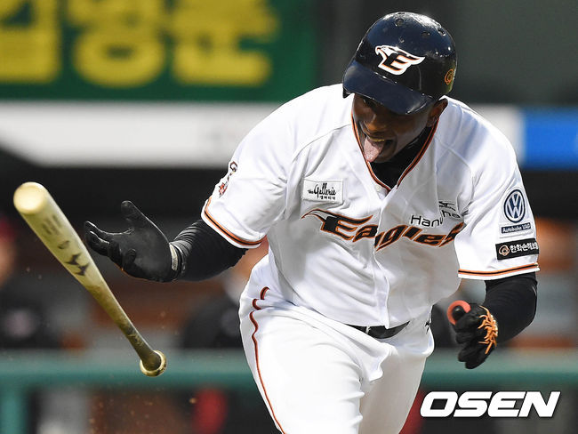 9일 오후 대전시 한화생명 이글스 파크에서 열린 '2015 타이어뱅크 KBO 리그' 한화 이글스와 LG 트윈스의 경기 2회말 선두타자 모건이 플라이볼을 치고 달리고 있다.