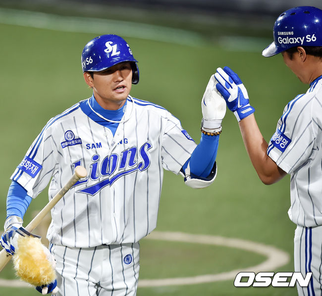 9일 오후 대구시민운동장 야구장에서 열린 '2015 타이어뱅크 KBO 리그' 삼성 라이온즈와 롯데 자이언츠의 경기, 2회말 1사 주자 3루 삼성 김상수가 좌월 투런홈런을 날린 후 홈에서 박한이와 하이파이브를 하고 있다.