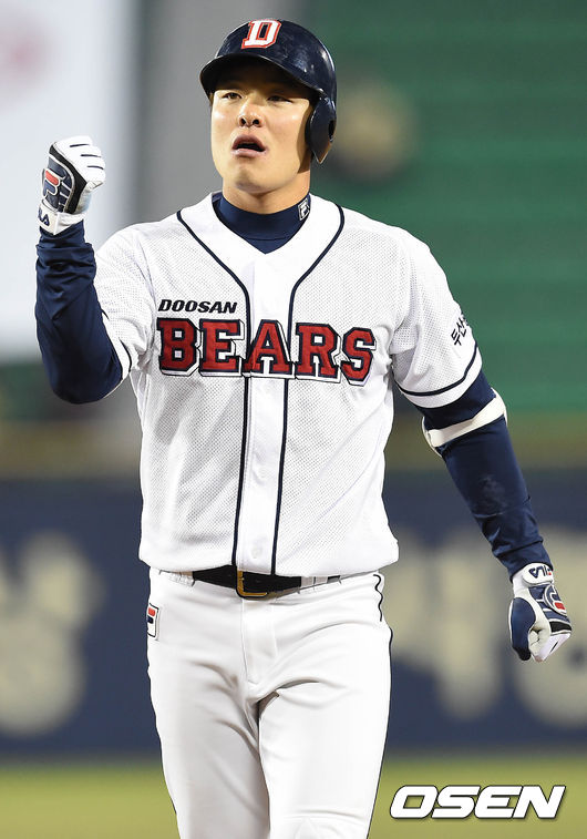 9일 오후 서울 잠실야구장에서 열린 '2015 타이어뱅크 KBO 리그' 두산 베어스와 넥센 히어로즈의 경기, 3회말 1사 주자 1,2루 두산 민병헌이 1타점 적시타를 치고 기뻐하고 있다.