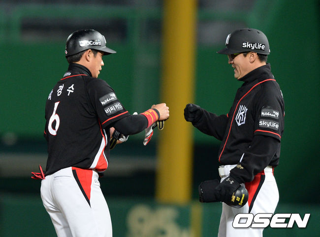 3회초 2사 3루에서 kt 박경수가 좌중간을 가르는 적시 2루타를 치고 김민재 코치와 하이파이브를 하고 있다.