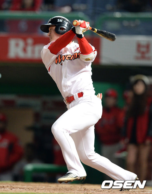 3회말 1사 1,2루에서 SK 김성현이 중전 적시타를 치고 있다.