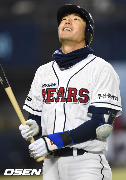 9일 오후 서울 잠실야구장에서 열린 '2015 타이어뱅크 KBO 리그' 두산 베어스와 넥센 히어로즈의 경기, 4회말 2사 1,3루 두산 김재호가 외야뜬공으로 아웃당하고 더그아웃으로 들어오고 있다.
