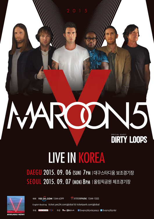 지난해 선보인 ‘V’ 앨범 또한 ‘맵스(Maps)’와 ‘애니몰즈(Animals)’ 등 싱글이 연이어 히트를 기록한 가운데 국내에서도 마룬5의 인기는 더욱 뜨거워졌다. ‘맵스’는 팝 음악으로서는 전례 없이 국내 주요 음원 종합 차트에서 국내 뮤지션의 곡들과 경쟁을 벌이며 1위를 차지했고, 애덤 리바인(Adam Levine)이 출연한 영화 '비긴 어게인(Begin Again)'의 흥행 돌풍과 더불어 ‘로스트 스타즈(Lost Stars)’ 등의 OST곡 또한 국내 음악 차트를 점령하면서 국민 밴드로 불리는 마룬5의 막강한 저력을 보여주었다.