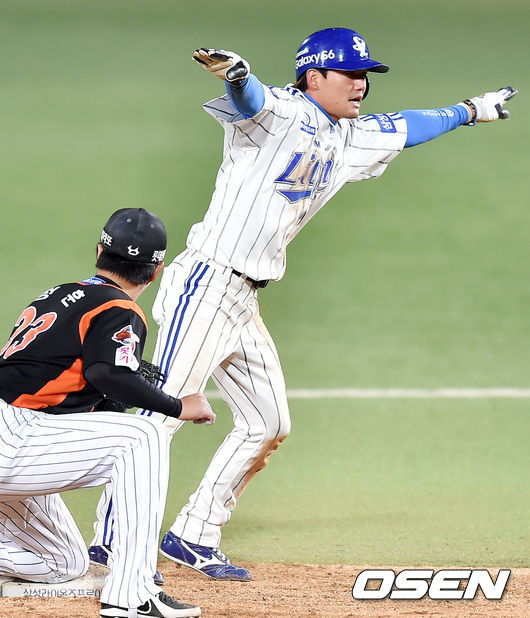 9일 오후 대구시민운동장 야구장에서 열린 '2015 타이어뱅크 KBO 리그' 삼성 라이온즈와 롯데 자이언츠의 경기, 6회말 2사 주자 1루 삼성 박석민 타석에서 1루 주자 김상수가 2루 도루에 성공한 후 확인을 하고 있다.