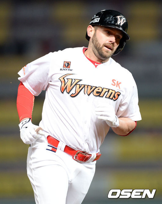 6회말 1사에서 SK 브라운이 좌중간 솔로 홈런을 치고 그라운드를 돌고 있다.