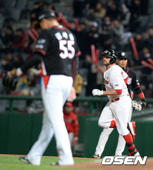 6회말 1사에서 SK 브라운이 좌중간 솔로 홈런을 치고 그라운드를 돌고 있다.