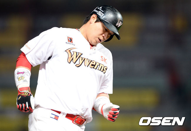 6회말 2사 1,2루에서 SK 정상호가 좌월 스리런 홈런을 치고 그라운드를 돌고 있다.