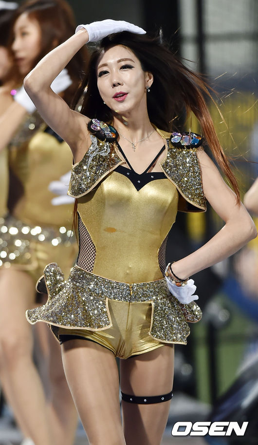 9일 오후 대구시민운동장 야구장에서 열린 '2015 타이어뱅크 KBO 리그' 삼성 라이온즈와 롯데 자이언츠의 경기, 삼성 치어리더 이연주가 화려한 공연을 펼치고 있다.