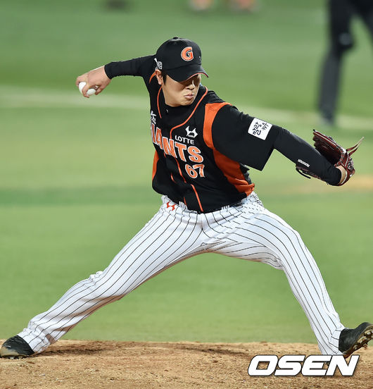 9일 오후 대구시민운동장 야구장에서 열린 '2015 타이어뱅크 KBO 리그' 삼성 라이온즈와 롯데 자이언츠의 경기, 8회말 1사 주자 2루 삼성 김상수 타석에서 마운드에 오른 롯데 김성배가 힘차게 공을 뿌리고 있다.