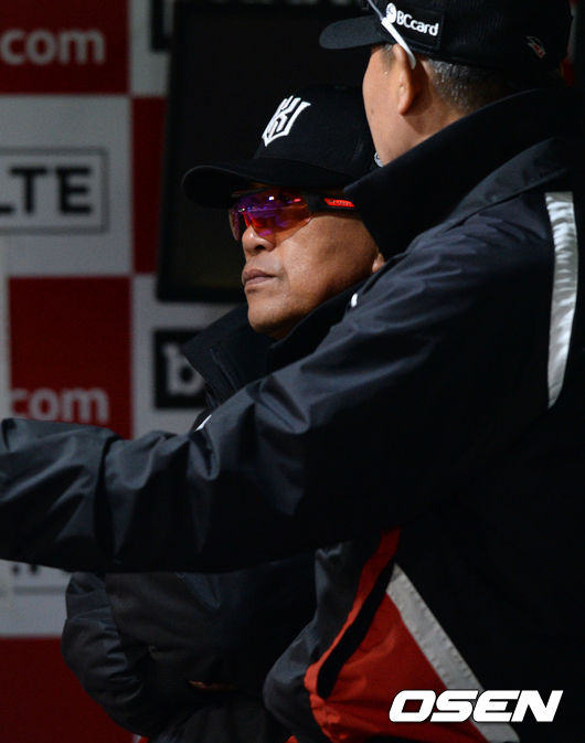 7회말 kt 조범현 감독이 더그아웃에서 경기를 바라보고 있다.
