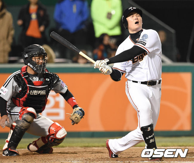 9일 오후 대전시 한화생명 이글스 파크에서 열린 '2015 타이어뱅크 KBO 리그' 한화 이글스와 LG 트윈스의 경기 8회말 2사 1,2루 이성열이 삼진을 당하고 있다.
