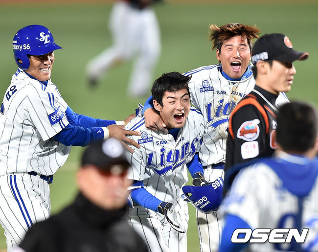경기를 마치며 끝내기 안타를 친 구자욱이 이승엽 김상수와 세리머니를 하고 있다. / rumi@osen.co.kr