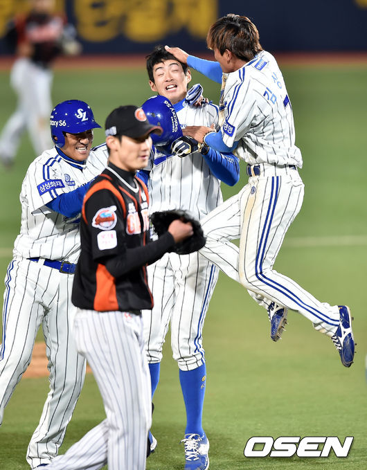 9회말 무사 주자 1,3루 삼성 구자욱이 끝내기 안타를 친 후 동료들과 기쁨을 나누고 있다. / rumi@osen.co.kr