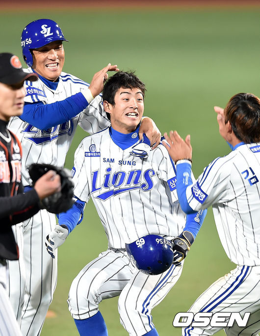 9회말 무사 주자 1,3루 삼성 구자욱이 끝내기 안타를 친 후 동료들과 기쁨을 나누고 있다. / rumi@osen.co.kr