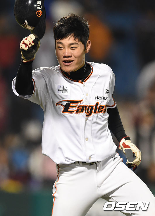 9일 오후 대전시 한화생명 이글스 파크에서 열린 '2015 타이어뱅크 KBO 리그' 한화 이글스와 LG 트윈스의 경기 9회말 1사 1루 주현상의 희생번트 상황, LG의 송구 실책을 틈타 홈까지 쇄도해 끝내기 득점한 강경학이 환호하고 있다.