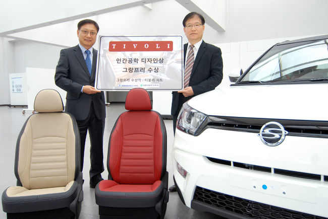 대한인간공학회가 주최하는 인간공학 디자인상 시상식에서 티볼리에 장착된 시트가 최고 영예인 그랑프리를 수상했다. 쌍용자동차 차량개발센터 이수원 전무(오른쪽)와 대원강업 구재광 상무가 티볼리 시트 옆에서 기념촬영을 하고 있다. /쌍용자동차 제공.