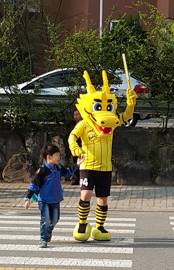 전남드래곤즈 마스코트인 철룡이는 10일 오전 8시 광양중진초등학교를 찾아 등교하는 학생들이 안전하게 횡단보도를 건널 수 있도록 안전지킴이 봉사활동을 실시했다.