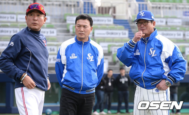 10일 오후 대구시민운동장 야구장에서 열리는 '2015 타이어뱅크 KBO 리그' 삼성 라이온즈와 KIA 타이거즈의 경기 시작전 류중일 감독과 김기태 감독이 이야기를 나누고 있다.