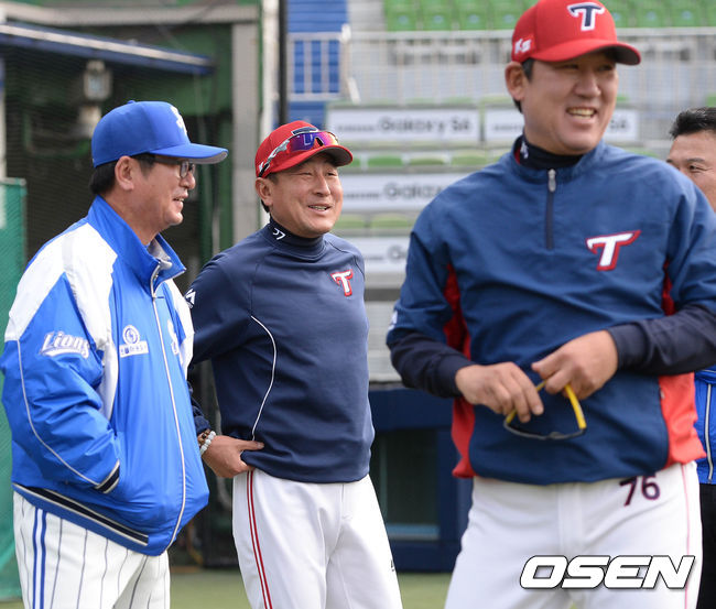 10일 오후 대구시민운동장 야구장에서 열리는 '2015 타이어뱅크 KBO 리그' 삼성 라이온즈와 KIA 타이거즈의 경기 시작전 류중일-김기태 감독과 조계현 코치가 이야기를 나누고 있다.