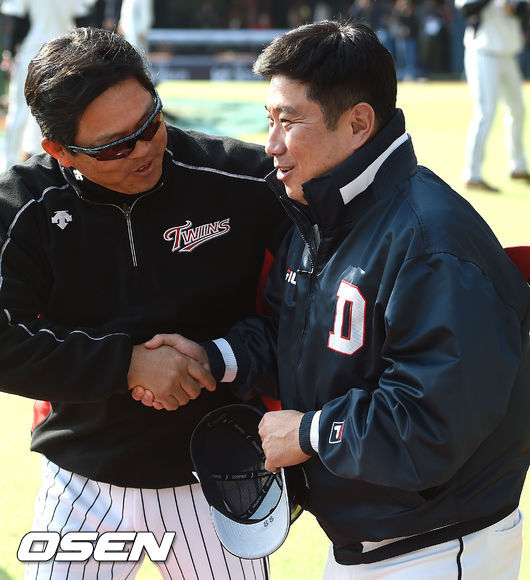 10일 오후 서울 잠실구장에서 열리는 ‘2015 타이어뱅크 KBO리그’ LG 트윈스와 두산 베어스의 경기에 앞서 LG 양상문 감독과 두산 김태형 감독이 인사를 나누고 있다.