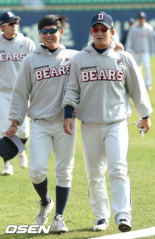 10일 오후 서울 잠실구장에서 열리는 ‘2015 타이어뱅크 KBO리그’ LG 트윈스와 두산 베어스의 경기에 앞서 두산 정수빈과 최재훈이 스트레칭을 마친뒤 더그아웃으로 들어가고 있다.
