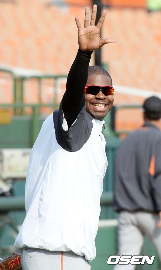 10일 오후 부산 사직구장서 '2015 타이어뱅크 KBO 리그' 롯데 자이언츠와 한화 이글스의 경기가 열릴 예정인 가운데, 한화 유먼이 롯데 최준석에게 인사를 하고 있다.