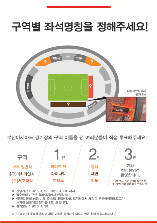 동시에 기존 터치라인석과 서포터석으로 불렸던 식상한 가변좌석 명칭을 탈피, 새로운 이름을 팬들과 함께 정하기로 했다. 부산아이파크는 홈페이지를 통해 명칭 선정에 팬들의 의견을 적극 반영하고 있다.