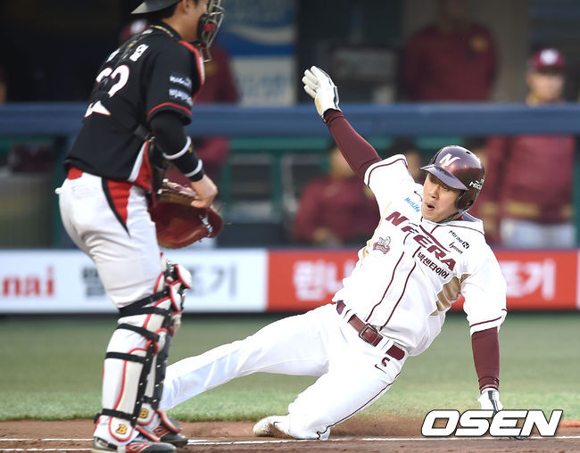1회말 2사 2루 넥센 김지수가 박병호의 안타로 득점을 올리고 있다.