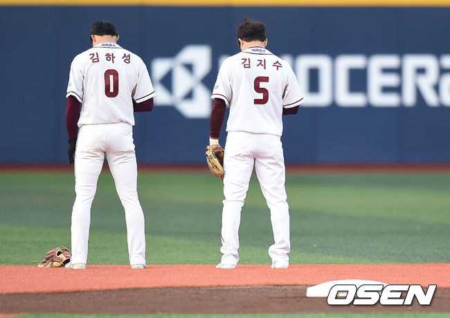 경기에 앞서 넥센 김하성과 김지수가 국기에 대한 경례를 하고 있다.