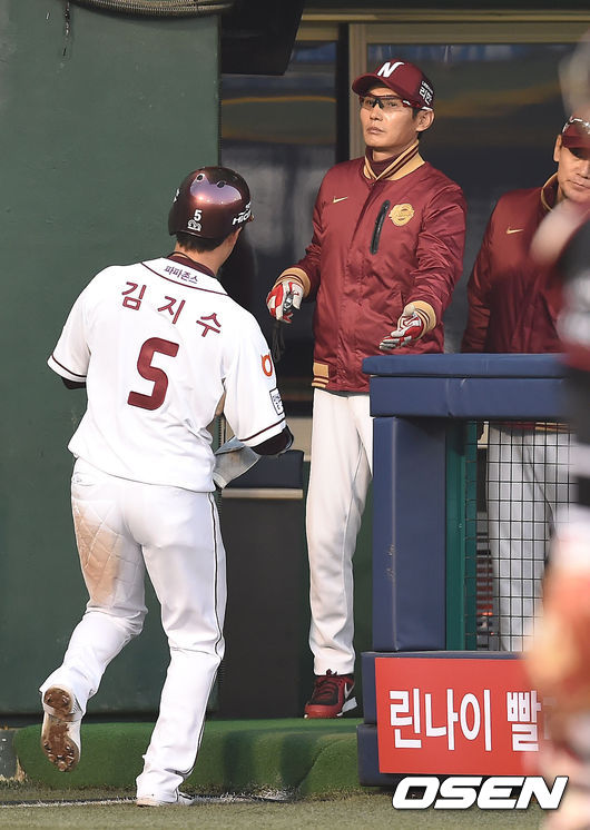 넥센 염경엽 감독이 1회말 2사 2루 박병호의 안타로 득점을 올린 김지수와 하이파이브를 하고 있다.