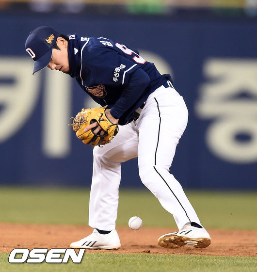 10일 오후 서울 잠실구장에서 열린 '2015 타이어뱅크 KBO리그' LG 트윈스와 두산 베어스의 경기, 2회말 1사 2,3루 LG 유강남의 내야땅볼때 두산 김재호 유격수가 실책성 수비를 하고 있다. 이 수비로 3루 주자 이진영은 선취득점, 타자는 1루에서 아웃됐다.