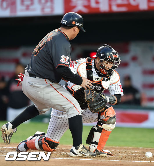 10일 오후 부산 사직구장서 열린 '2015 타이어뱅크 KBO 리그' 롯데 자이언츠와 한화 이글스의 경기, 2회 무사 1,3루에서 한화 이시찬의 내야 땅볼 타구 때 3루주자 김태균이 득점에 성공할때 강민호가 볼을 빠트리고 있다.