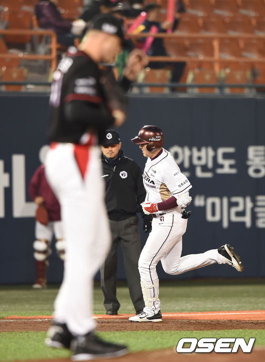 3회말 2사 1루 넥센 유한준이 kt 시스코를 상대로 투런 홈런을 때린 뒤 베이스를 돌고 있다.
