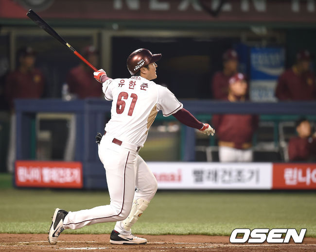 3회말 2사 1루 넥센 유한준이 kt 시스코를 상대로 투런 홈런을 때린 뒤 타구를 바라보고 있다.
